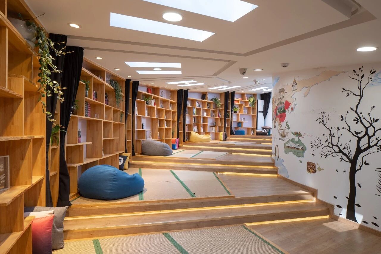 “在亦庄的东尚·E园,一个地下空间里,顺着左侧弧线是五六个渐高的地台,铺着镶嵌绿条纹的榻榻米,上有灰、黑、黄色的懒人沙发,还有靠枕。架上是触手可及的经典图书和绿植。”